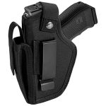 hEIMORIOTO Pistol Holster is a versatile gun holster that fits most pistol sizes, including Glock, Sig Sauer, S&W, Ruger, Beretta, Springfield, Kimber, Walther, and more. Made of waterproof and sturdy nylon, the holster features a resistant elastic cord that prevents the pistol from sliding or moving. You can use it on both right and left sides and clip it onto a 2-inch-wide belt. The elastic thumb break retention belts of the holster prevent your weapon from bouncing out and draw the firearm quickly and effectively. The sleek design of this holster allows you to carry concealed discreetly with no possibility of firearm showing through your pants. With a 100% satisfaction guarantee, you can trust HEIMORIOTO Pistol Holster for your concealed carry needs.