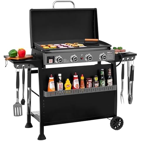 The Royal Gourmet PD4001 4-Burner Propane Griddle with Cart from Royal Gourmet offers great flexibility by easily switching from a stand-alone grill to a tabletop design, so you can cook wherever you prefer. Its heat-resistant hood protects the cooking surface from dirt and weather when not in use, helping to keep your griddle in good condition. When cooking, the hood also acts as a wind guard to keep your flames steady. The large 389 sq. in. cooking area heats evenly thanks to four stainless steel burners producing 34,000 BTUs, ensuring your food cooks uniformly. Plus, the side shelves give you extra space for prep and tools, making your outdoor cooking more organized and convenient.