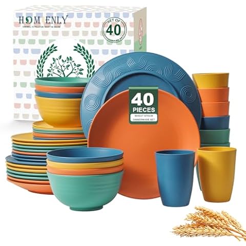 The Homienly 40-Piece Wheat Straw Dinnerware Set from Homienly offers a complete 40-piece collection, suitable for serving up to eight people with plates, bowls, and cups in different sizes. This set is made from lightweight, durable wheat straw, which is safe and non-toxic, making it ideal for families with children or seniors who require sturdy, unbreakable dishes. The unique textured bottom of the pieces prevents slipping, adding both style and safety to meals. The set is also microwave and dishwasher safe, providing convenient heating and hassle-free cleaning.