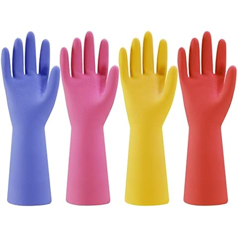 the Bamllum Dishwashing Gloves are made of soft and skin-friendly natural rubber, providing protection from corrosive liquids and keeping your hands and clothes dry. The palm and fingers feature a non-slip design with granules that increase friction, ensuring a better grip and control. These gloves have a comfortable fit with a thin layer of planting velvet inside that won't shift when worn, providing excellent comfort and softness. They are perfect for extended use as they absorb moisture and sweat, keeping your hands warm and dry. These durable and reusable rubber gloves are suitable for a variety of tasks, including kitchen and bathroom work, pet grooming, household cleaning, gardening, and more. With four different colors, they are easy to distinguish and suitable for various purposes. If you are not satisfied with your purchase, the after-sales service will promptly address any issues.