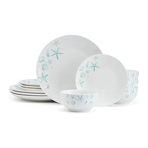 The from is a modern and whimsical addition to your dining table. Crafted from durable, crisp white porcelain, this 12-piece set includes 4 each of 10-1/2 inch dinner plates, 7-1/2 inch salad plates, and 5-1/2 inch all-purpose bowls with a 16-fluid ounce capacity. The charming pattern of ocean blue starfish and seashells flowing up the side of each piece creates a delightful beach-inspired ambiance, transforming every meal into a seaside experience. This set is suitable for both everyday dining and light entertaining, and is dishwasher and microwave safe.