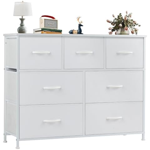 OLIXIS Dresser for Bedroom, 7 Storage Drawers, Wide Fabric Closet Chests Organizer Tower Furniture, TV Stand with Wooden Top Metal Frame for Clothes, Living Room, Hallway, Entryway, Classic White