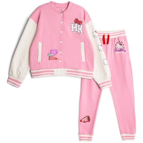 The Hello Kitty Big Girls Fleece Varsity Jacket & Joggers Set from Hello Kitty offers a cozy and stylish outfit with jogger-style pants featuring an elastic waistband and drawstring for a comfortable, adjustable fit, and a vintage varsity jacket with ribbed cuffs and waist to keep the cold out, complemented by easy snap buttons and fun Hello Kitty graphics and chenille patches.