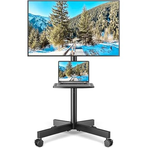 The KKTONER Mobile TV Cart for 23-65 inch TVs from KKTONER is designed to fit most 23 to 65-inch flat or curved TVs, supporting up to 88 pounds, with adjustable height and tilt, a handy shelf, and 360-degree swivel wheels for easy mobility.